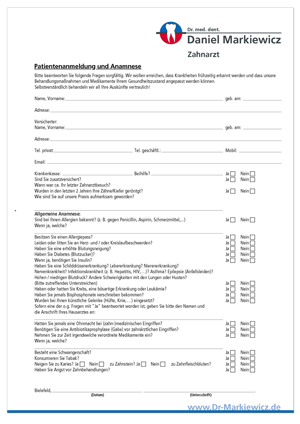 Zur Verkürzung der Wartezeit in der Praxis, können Sie schon zu Hause den Anamnesebogen an Ihrem Computer z.B. mit dem Programm "Adobe Acrobat" online ausfüllen, ausdrucken, und schon ausgefüllt mit in die Praxis bringen.